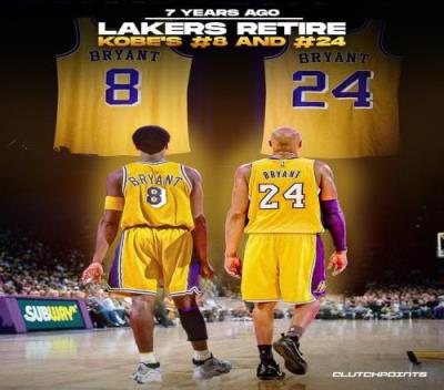 历史唯一七年前的今天:湖人退役科比8号和24号球衣