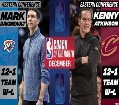 体育资讯1月3日报道宣称 今日NBA官方宣布,雷霆主帅戴格诺特与骑士主帅阿特金森在12月中被评为西部和东部联盟月度最佳教练。