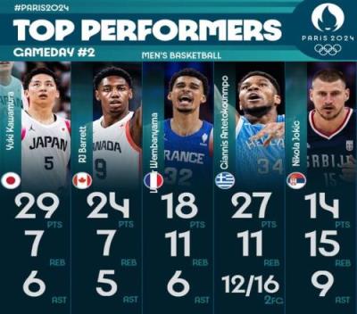 奥运男篮第2比赛日,日本90比94不敌法国,加拿大93比83澳大利亚,希腊77比84西班牙,塞尔维亚107比66波多黎各。