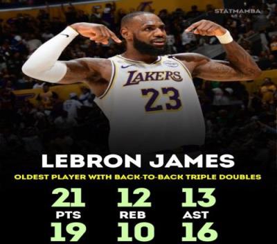 这样一来,詹姆斯(39岁317天)打破了自己所保持的连续三双最老纪录,此前他曾在2021年3月15日和16日背靠背拿到过三双数据。