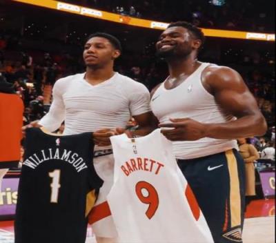 NBA常规赛,猛龙队113-104战胜鹈鹕队。赛后,锡安和巴雷特交换了球衣。