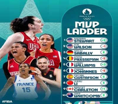 新一期奥运会女篮MVP榜:李月汝第8斯图尔特&阿贾威尔逊前二