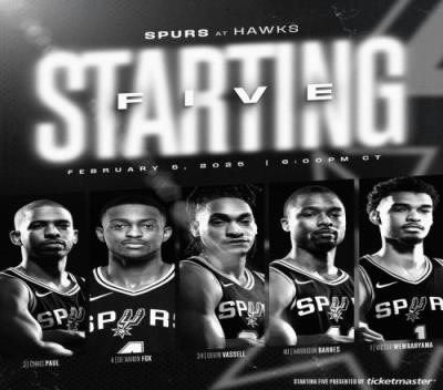 除保罗和福克斯外,马刺另外三位首发球员为文班亚马、巴恩斯、瓦塞尔。