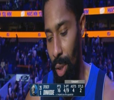 本场比赛,独行侠球员丁威迪表现不错,尤其是末节拿到7分命中两记关键三分帮助球队收下比赛,在30分钟的时间里,投篮13中5,三分球9中4,罚球3中2,拿到16分3篮板4助攻2抢断的数据,正负值+13。
