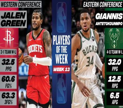 体育资讯01月21日报道宣称 NBA官方公布了第13周的东西部最佳球员,火箭的杰伦-格林和雄鹿的字母哥分别当选。