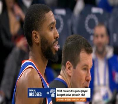 比赛中转播方把镜头给到尼克斯球员米卡尔-布里奇斯,并晒出数据:算上今天大桥已连续出战555场,这是现役球员的最长纪录。