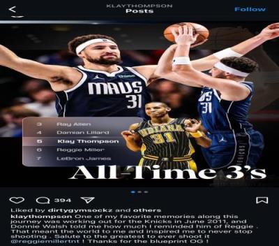 体育资讯12月27日报道宣称 克莱今日更新Instagram,晒照纪念自己超越偶像雷吉-米勒的三分里程碑。