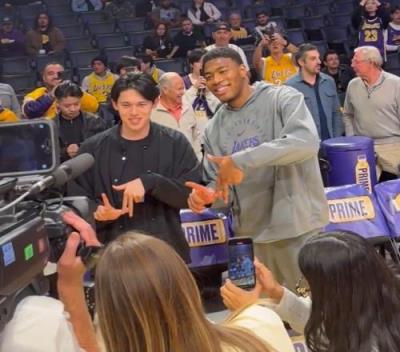 赛前,最近加盟MLB道奇队的日本天才棒球手佐佐木朗希与老乡八村塁见面,后者教其比出LA的手势。