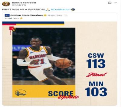 赛后,勇士新援施罗德转发了自己的赢球海报,并写道:“效力勇士的第一场胜利。”