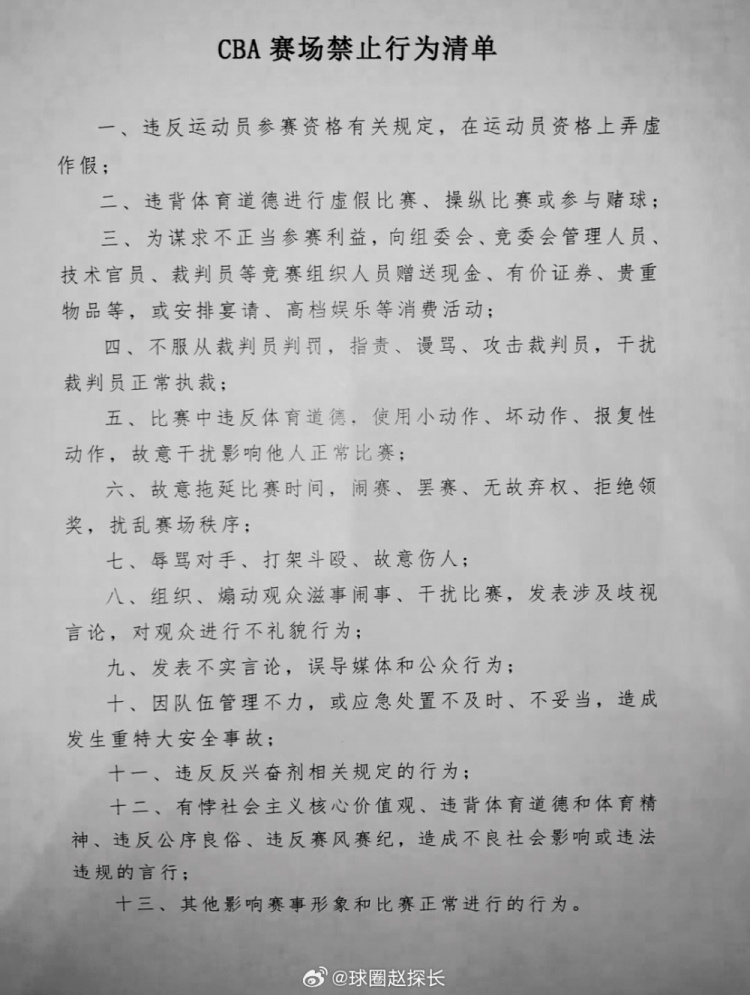 这份《CBA赛场禁止行为清单》是对所有参与联赛的运动员、教练员以及其他相关人员的明确告诫。它不仅是规范赛场行为、维护赛风赛纪的具体措施,也是推动中国篮球运动健康、有序发展的重要一步。