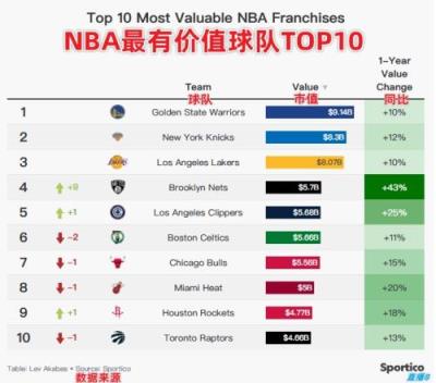 最高91亿刀!NBA球队2024市值排行:勇尼湖断层前三篮网蹿升9名