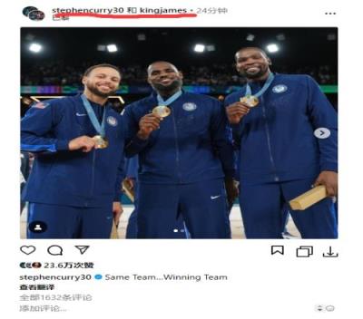 第一张是奥运夺金后的合影,另一张则是队内训练库里防守KD,詹姆斯在身后观察。