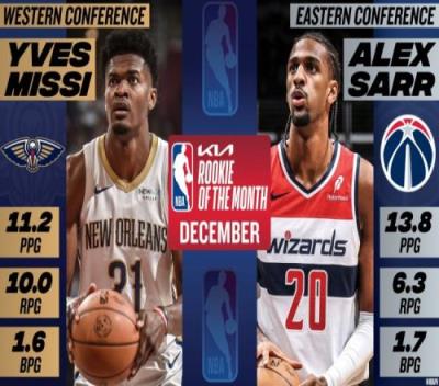 体育资讯1月3日报道宣称 今日NBA官方宣布,鹈鹕21号秀米西和奇才榜眼萨尔在12月的比赛分别被评为NBA西部和东部月最佳新秀。
