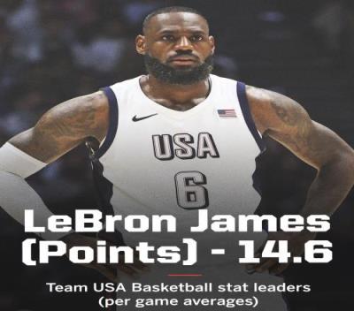体育资讯7月26日报道宣称 湖人官推发布统计,美国男篮五场热身赛,詹姆斯多项数据排名全队第一: