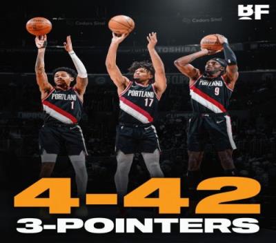 据统计,开拓者今日全队三分手感糟糕,全场三分合计42投仅4中,命中率低至9.5%,并列NBA历史第8差(至少出手30次)!