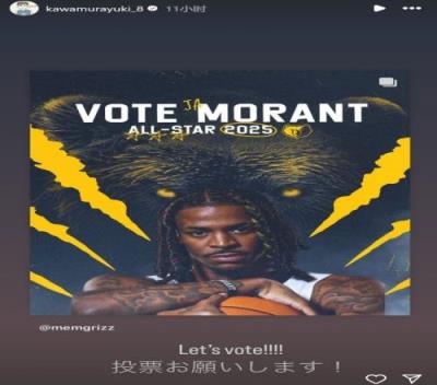 体育资讯1月8日报道宣称 昨天,灰熊后卫河村勇辉在INS上为队友莫兰特、贝恩和小贾伦-杰克逊拉票全明星。