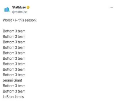 本赛季至今,詹姆斯的累计正负值为-132(在湖人队内垫底),在联盟排名倒数第13位(正数第482位)。