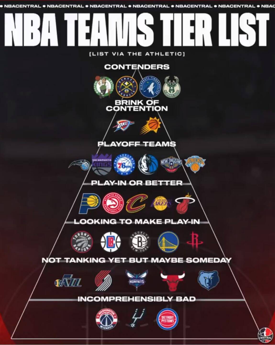 据知名美国媒体报道,TA最近对NBA球队进行了分档评价,将球队分为不同层次。