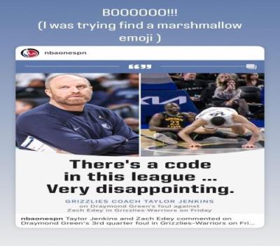 针对这一言论,追梦更新个人社媒,发出詹金斯的这段话并写道:“切,我在找棉花糖的表情包(嘲讽对面软)。”
