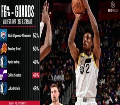 转播方给到一组数据,在最近的三个赛季中,投篮命中率(出手至少2000+)Top5的后卫如下: