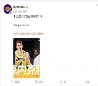 赛后湖人官方微博晒出克内克特海报,写道:“这四个字怎么写来着?zui jia xin xiu”