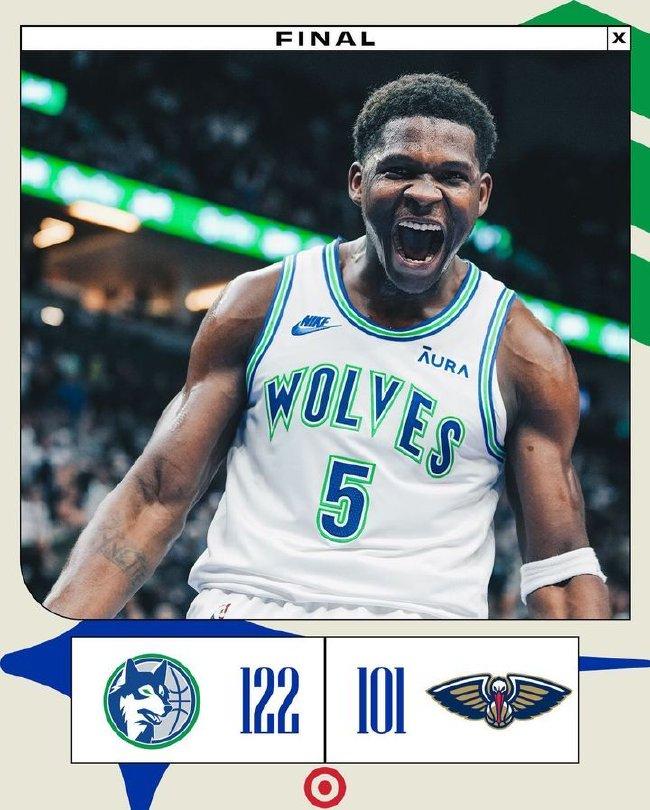 NBA常规赛进行,森林狼主场以122-101大胜鹈鹕,豪取四连胜,战绩高居西部排名第四,成为本赛季的黑马候选。