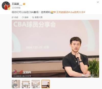 王岚嵚晒出自己参加今年CBA选秀前的球员分享会照片,并写道:“祝你们可以站在CBA赛场!选秀顺利。”