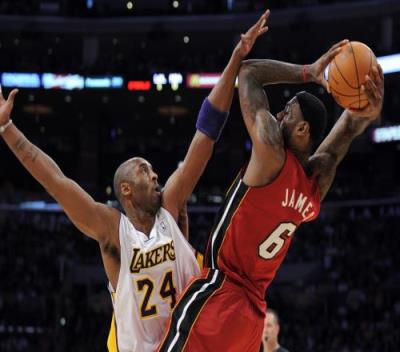 本场比赛,热火以99-90击败湖人,詹姆斯得到39分7篮板8助攻,科比得到22分4篮板。