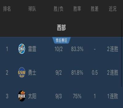 今日赛后,雷霆战绩来到10-2,夺取西部第一,太阳输球后战绩来到9-3落到西部第三,今日没有比赛的勇士以9-2的战绩升至西部第二。
