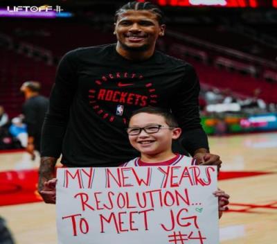 今天,一位小球迷举着“我的新年愿望就是见到杰伦-格林”的牌子现场观战,杰伦-格林暖心与他合影,并为他的球衣签名。