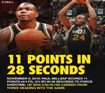 纵观米尔萨普的职业生涯,当年对阵热火三巨头时的28秒11分是永恒经典。