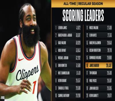 传奇仍在路上!哈登生涯总得分超越邓肯升至NBA历史第16位!