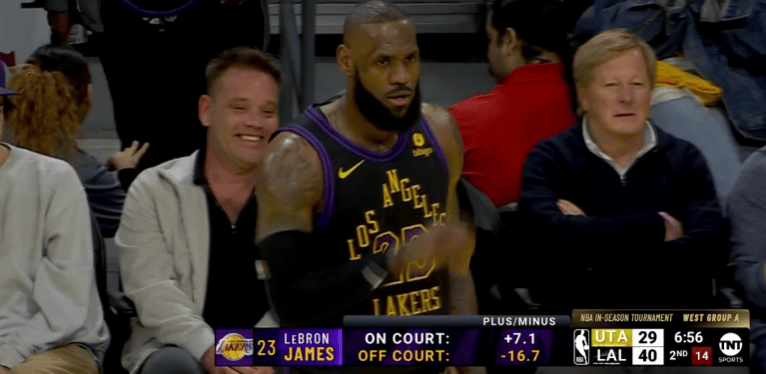 NBA季中锦标赛西部A组的一场激烈对决在进行中,湖人队迎战爵士队。转播方透露了一组惊人的数据,揭示出了湖人队中詹姆斯的离场影响力。