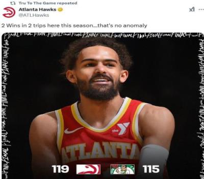 赛后,特雷-杨也出现在了老鹰的赢球海报上,老鹰官推配文:“两次客场挑战绿军都取得了胜利,这不罕见。”