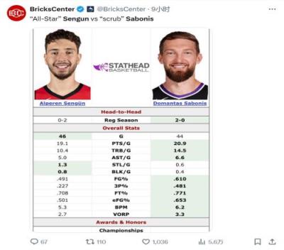 数据全包围!美媒晒图:“全明星”申京VS“被冷落的”小萨
