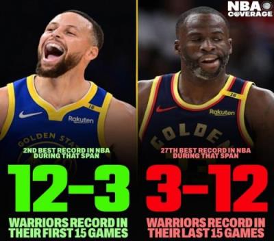 啥问题哇勇士赛季前15场12胜3负联盟第2之后3胜12负联盟倒3