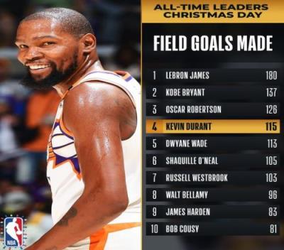 至此,杜兰特的圣诞大战运动战进球数来到了115个,超越韦德(113)升至NBA历史第四位。前三分别是: