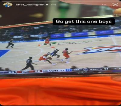 开场不久,雷霆球员切特-霍姆格伦在与勇士球员安德鲁-维金斯空中对抗后落地痛苦不已,随后离场。
