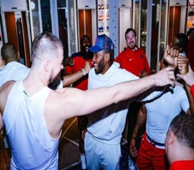 快船官方晒照,莱昂纳德赛后来到更衣室与队友一起庆祝胜利!