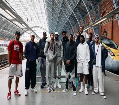 美国男篮高铁站全家福:老詹搂着哈利库里双手插兜小帅秀长腿