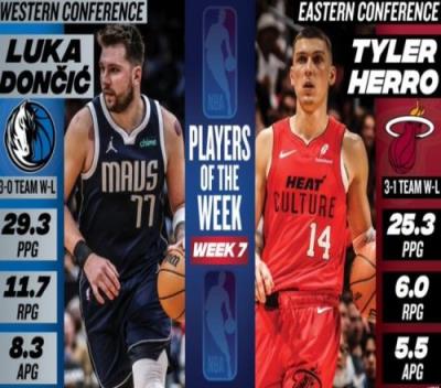 体育资讯12月10日报道宣称 今日NBA官方宣布,独行侠的东契奇、热火的希罗当选为本赛季第七周东西部周最佳球员。