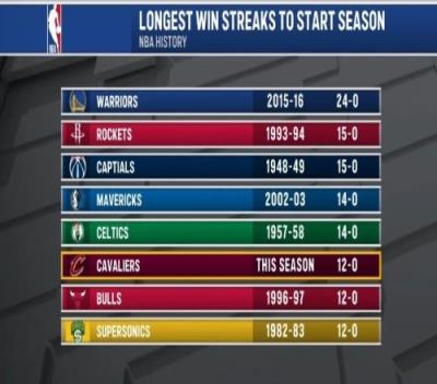 至此,本赛季的骑士能排到历史开季最长连胜战绩榜的并列第6位,在他们前面的有: