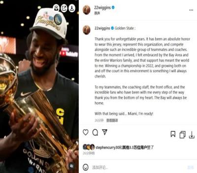 维金斯发文告别勇士:湾区永远是我的家!热火!我准备好了!