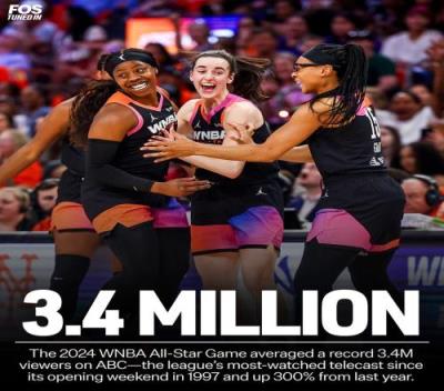 体育资讯07月25日报道宣称 上周末进行的2024菲尼克斯WNBA全明星赛,近日公布比赛收视率,本届由ABC电视台直播的全明星正赛,平均收视率达到344.2万(峰值为405.4万)!相比去年的85万增长了305%!是WNBA历史收视率最高的全明星赛!