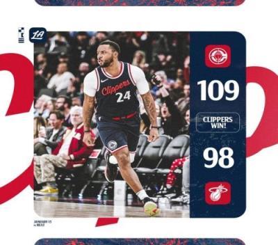 体育资讯1月14日报道宣称 NBA常规赛,快船109-98击败热火。