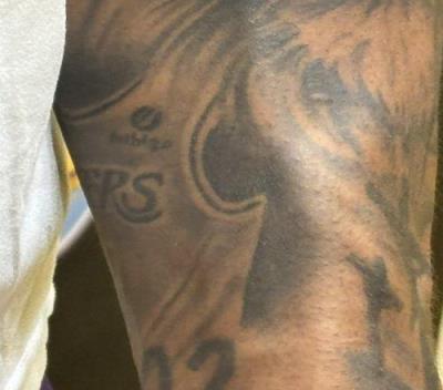 湖人刘易斯在左臂文上了他的湖人球衣甚至还文上了赞助商LOGO