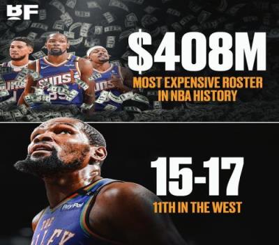 2024-25赛季,太阳的球员年薪加起来是2.26亿美金,超奢侈税线5470万美金,超奢侈税第二道围栏3700万美金,算上要缴纳的奢侈税,太阳队在球员薪金这一项的支出,高达4.08亿美金。