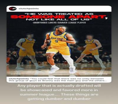 体育资讯7月27日报道宣称 据此前报道,一名匿名湖人夏联球员痛斥布朗尼:“他有特殊待遇,他不配得到那个位置。”