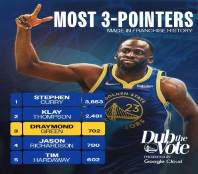 就此,追梦的生涯命中了702个三分,排名勇士队史第三,前二是他一起拿下四冠的水花兄弟,他距离第二的克莱“仅差”1779个三分。