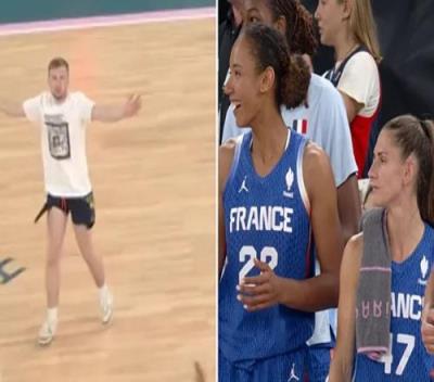 在比赛还剩6.9秒时,一名男子突然闯入赛场挥舞他的手臂,令当场的女球员十分错愕,裁判因此中断了比赛,随后该名男子被保安带走。